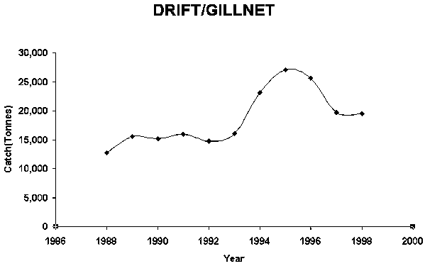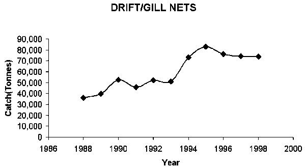 The state of Gujarat, currently the biggest producer of marine fish in the country, faces economic and biological overfishing pressures. The marine fish production of Gujarat has dropped by over 27 per cent to 552 000 tonnes in 1998-99, from a peak of 702 000 tonnes in 1997-98. Since the formation of the state in 1960 until 1998-99, when its total marine fish production increased sevenfold, the size of its mechanized fleet (both IBM- and OBM-powered vessels) expanded 50-fold, and the value of fish production increased by over 500 times. There were about 17 000 mechanized fishing vessels on the register in 1998-99, of which over 14 000 vessels were IBM-powered vessels.