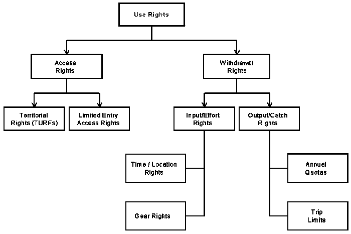 Two points are in order here. First, most of the use rights options to be described here correspond to an input or output control discussed in Chapter 4; they are really the same thing, seen from differing perspectives. For example, limited entry - seen as an input control from the perspective of resource management - corresponds to an access right from the perspective of fishers management. Similarly, the fisher might see a control placed on the number of traps he or she is allowed to use in a fishery as a (negative) restriction, or as a (positive) use right. Therefore, there is some overlap between the content of this section and that presented in Chapter 4 - the reader is referred to the latter for more details on the various input and output controls that underlie use rights.