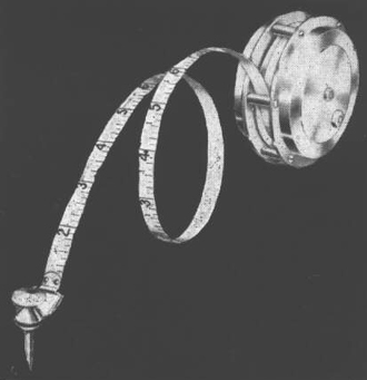 Puede usarse en el bosque o en el aserradero. Cinta de acero con cifras negras sobre fondo blanco. Longitud 360 cm. (146 pulgadas). Arrollamiento automático. No presenta abertura alguna en su periferia por la que puedan entrar suciedades. Para ajustar la tensión correcta al instalar una nueva cinta o para variar el punto de parada, basta con aflojar los seis tornillos que unen el anillo externo a la tapa.
