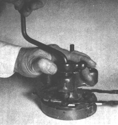 Aparato de banco para desmontar cadenas de sierra y recalcar los nuevos remaches. Consta normalmente de los elementos siguientes: 3 quijadas de apoyo para las cadenas de 10, 11 y 12,5 mm. (4/10, 7/16 y ½ pulgadas) de paso, respectivamente; un punzón; un conjunto recalcador de remaches; dos quijadas de remachado; dos estampas de recalcar, un eje de giro y un tornillo de rosca madera para unir la base al banco de trabajo.