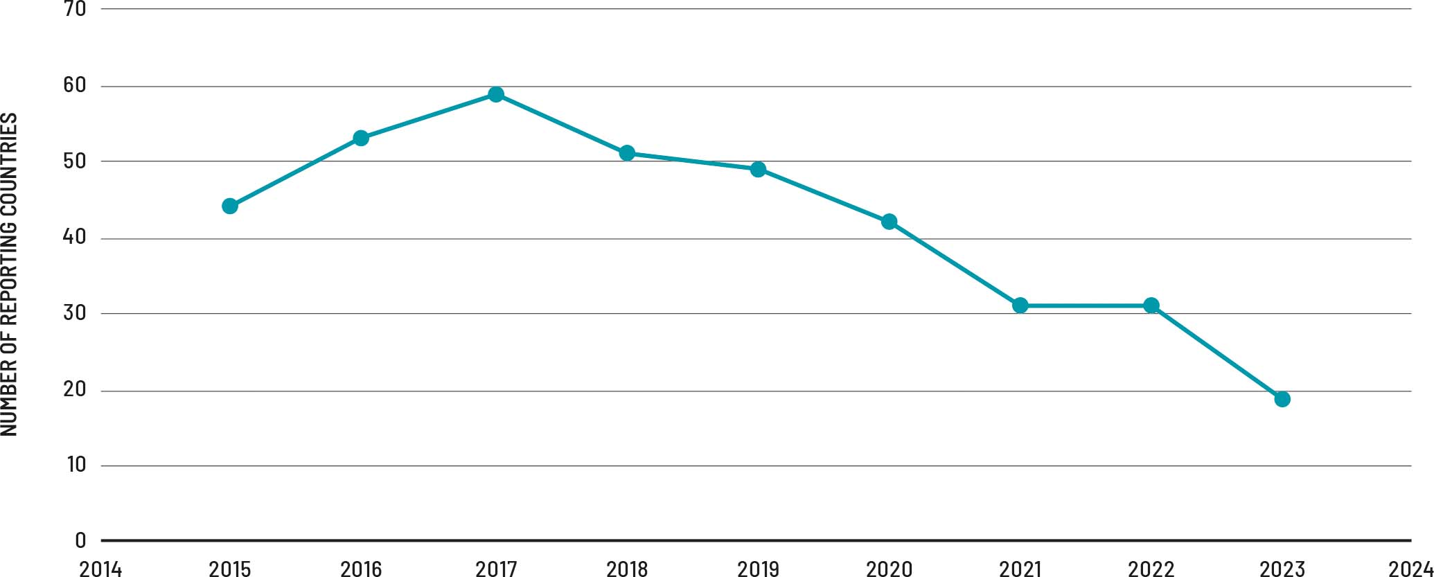 The indicator system relies on voluntary annual reporting by Member States through the Sendai Framework Monitor, creating a baseline and longitudinal datasets that support comparative analysis and progress tracking of disaster losses over time. The implementation of the Sendai Framework Monitor reveals progress in efforts by countries to establish standardized monitoring systems and develop national disaster loss databases for systematic impact monitoring. But it also highlights persistent challenges in data collection and analysis, as well as the institutional capacities of countries that limit the scope of global monitoring efforts. While agricultural loss reporting by member states has expanded since the framework’s adoption, with a total of 87 countries reporting at least once under indicator C2 since 2015, the overall number of reports is relatively low and the number of countries reporting has considerably declined in recent years (see FIGURE 1).