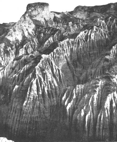The loess is soft and porous. In the mass it behaves like permeable rock. It is easily channeled and shaped. Acted upon by atmospheric agents, the loess crumbles apart causing vertical-walled ravines - a consequence of the material's permeability and cohesion without hardness. Hence it can be easily shaped by men into descending terraces like giant staircases: and such cultivated terraces make up a landscape typical of all the loess mountain regions of China.