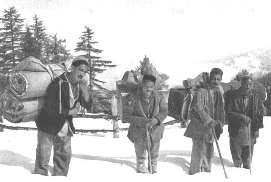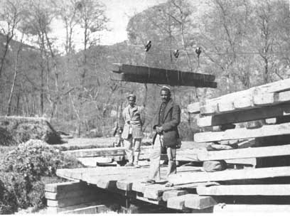 This system of timber extraction appears well suited to the kind of conditions that, for a long time, have prevailed in these mountains. Labor is very cheap and the standard of life low. At night, the workers take shelter under a rock or bluff, and they have a simple meal only twice a day. Clothing is far from being adequate for the heavy work, and tools are mostly primitive, consisting of crude, village-made axes, some primitive cross-cut saws, a ripping saw and perhaps a pole for turning a log, if required.