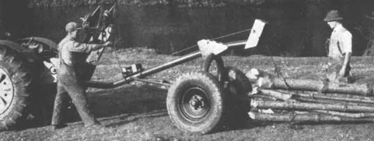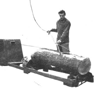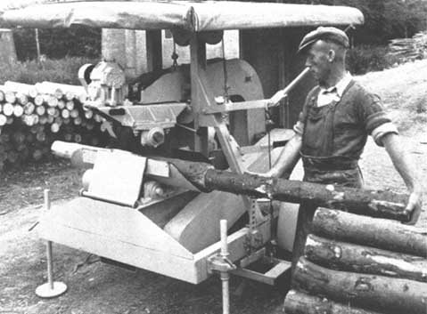 MOBILE SAW for the conversion of thinnings into pitprops. All operations hydraulically controlled. Aircooled diesel engine.