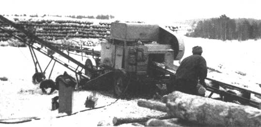 MOBILE WOOD CHOPPER "NORTHGATE" for converting tree tops, small branches, brushwood, etc., into fuelwood of 6 inch (16 cm.) lengths. Self-contained power unit. Automatic device for loading into wagons.