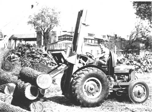 TRACTOR LOG TONGS ATTACHMENT for Allis Chalmers tractors "H.D. 15 G" or "H.D. 20 G'. Hydraulically-operated equipment intended for lifting and carrying loads from 12,000 to 16,000 lb. (5,400 - 7,300 kg)