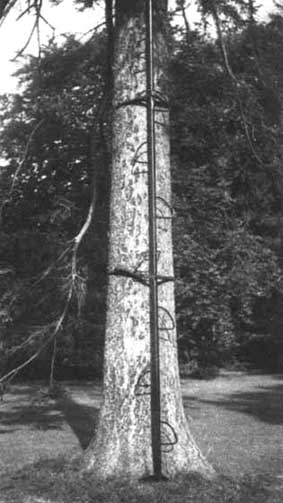 Un aparato especial para trepar a los árboles es el construido en Suiza y denominado «Baumvelo» (Figura 5). Se trata de un dispositivo para escalar árboles derechos y sin ramas, sin dañarlos, y es preferible a las escalas porque es mucho más fácil de transportar y de utilizar en las masas forestales densas. Consiste en dos piezas semejantes, una para cada pierna. Un brazo vertical sostiene un pedal donde se sujeta el pie del trepador. En su extremo superior está unido a una cinta de acero que forma una circunferencia de diámetro ajustable alrededor del tronco. En la mitad del brazo se fija una plancha soporte. Una vez que llega a la copa, el trepador puede dejar fácilmente el «Baumvelo»atado a una rama y trepar a través de la copa, para lo cual lleva correas de seguridad especiales. Este dispositivo lo ha creado la Eidg. Forstliche Versuchsanstalt, de Zurich, y ha sido acogido favorablemente en diversos países, sobre todo en Gran Bretaña, donde la Forestry Commission ha perfeccionado el dispositivo de seguridad.