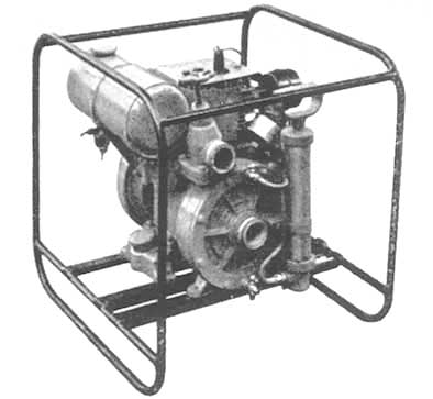 - Motor industrial de gasolina de 4 tiempos, alta velocidad y refrigeración por aire, con encendido por magneto y ruptor, regulador manual de velocidad y sistema de lubricación por salpicadura. Un cigüeñal de construcción especial y un adaptador acoplan el motor a la bomba con perfecto ajuste.