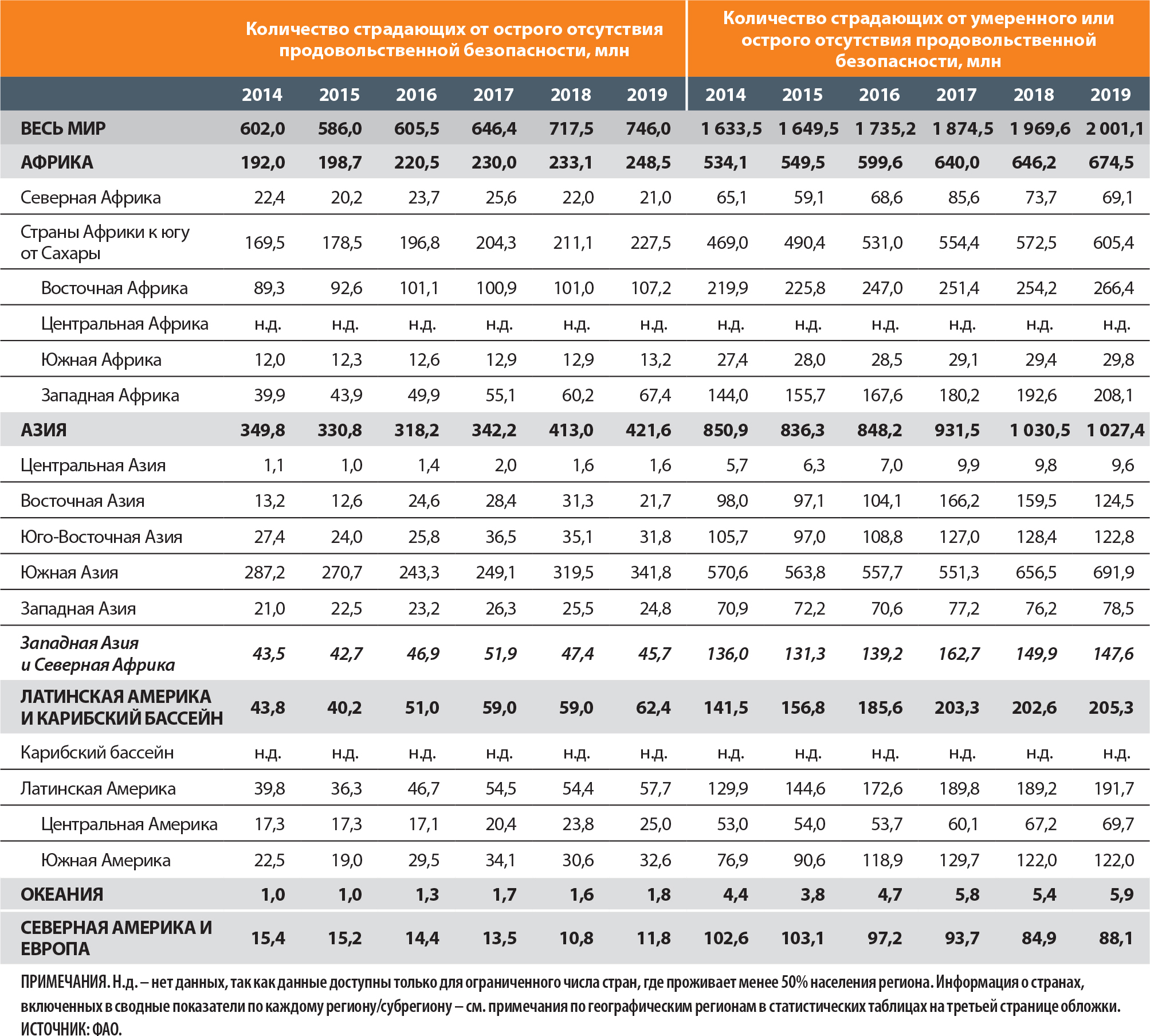 Согласно наиболее актуальным оценкам по итогам 2019 года, до начала пандемии COVID-19 достаточного питания не получали 690 млн человек, то есть 8,9% населения планеты. В основу этих расчетов легли новые данные о численности населения, предложении продовольствия и, что особенно важно, результаты нового обследования домохозяйств, позволившие скорректировать показатели неравенства в потреблении продовольствия для 13 стран, в том числе для Китая, где показатели отсутствия достаточного питания были пересмотрены начиная с 2000 года, в результате чего данные об общем количестве страдающего от недоедания населения в мире также были изменены в сторону сокращения. Это обусловлено тем, что население Китая составляет пятую часть населения Земли. Тем не менее тенденция, отмеченная в предыдущих выпусках доклада, не изменилась: начиная с 2014 года количество страдающих от голода в мире медленно растет. Новые расчеты по 2019 году показали, что за период с 2014 года число людей, не получающих достаточного питания, увеличилось на 60 миллионов. Если эта тенденция сохранится, к 2030 году количество голодающих на планете превысит 840 миллионов. Отсюда следует, что даже без учета вероятного увеличения числа голодающих вследствие пандемии COVID-19 мир не успевает в установленные сроки достичь нулевого голода. Представленные в настоящем докладе предварительные оценки на основе наиболее актуальных прогнозов развития мировой экономики указывают на то, что в 2020 году воздействие COVID-19 может обернуться увеличением количества лишенных достаточного питания людей на 83-132 миллиона.
