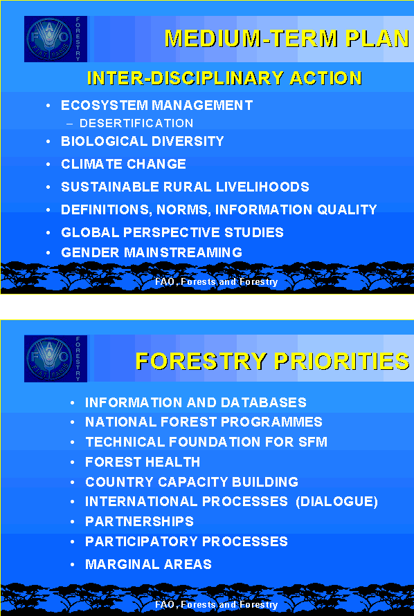 4 For a more accurate and complete description of FAO's role and key activities in forestry, see: FAO Strategic Plan for Forestry, available from FAO, Rome and, on-line, at: www.fao.org/forestry/fo/strategy/vision-e.stm and the FAO Strategic Framework, adopted by the FAO Council in November 1999- see:www.fao.org/strategicframework/