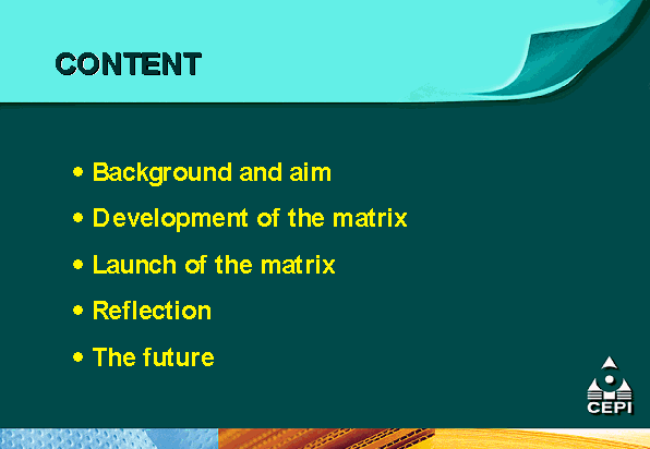 - the Confederation of European Paper Industries (CEPI) is supporting mutual recognition efforts through the development of a comparative matrix of different certification systems as an educational tool for its members and pulp and paper customers;