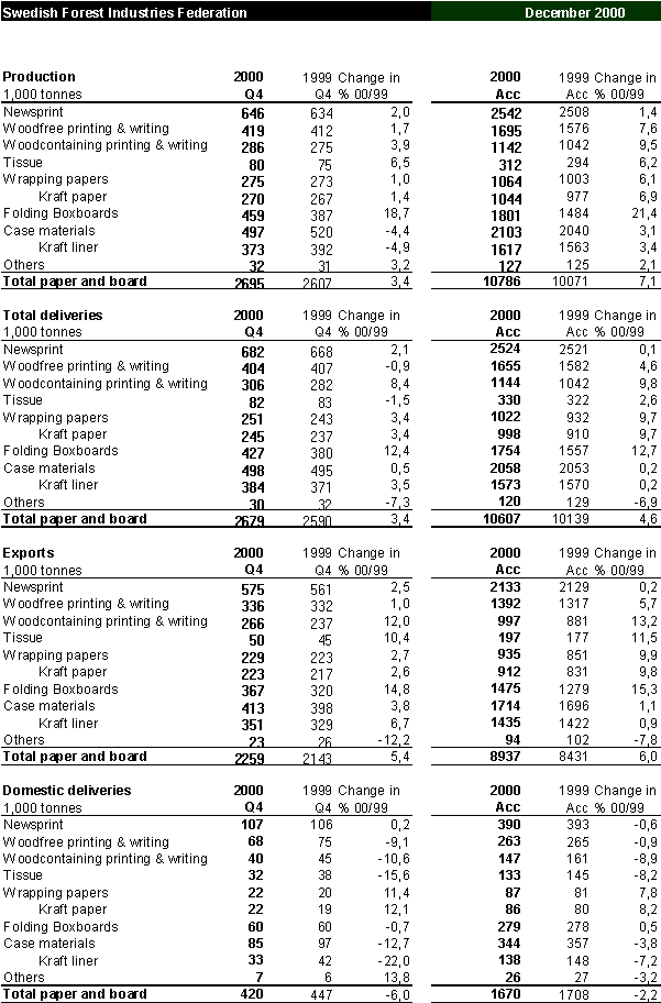 According to the most recent capacity survey, paper and board capacity will increase by 70 000 tonnes to 11.18 million tonnes in 2001. Market pulp capacity will increase by 150 000 tonnes in 2001.