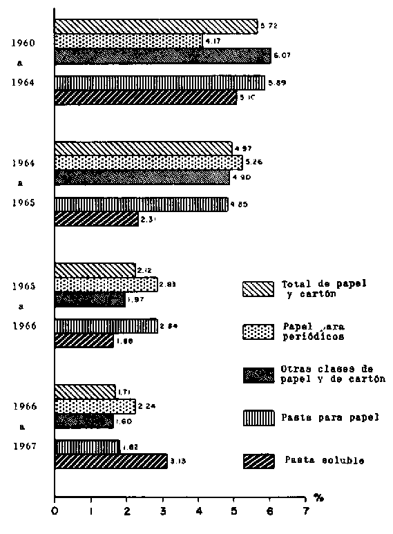 La capacidad de producción de papel para periódicos de 1960 a 1964 aumentó a un ritmo menor que la de otros papeles y cartones (Cuadro 2, Figura 2), pero dado el crecimiento más lento de la demanda de papel para periódicos tal capacidad ha resultado excesiva. El aumento de la capacidad de producción de papel para periódicos de 1964 a 1965 es probable que exceda el ritmo de aumento entre 1960 y 1964, pero parece que el incremento será algo más lento de 1965 a 1966. Lo mismo que desde 1960 a 1964 la capacidad de producción de papel para periódicos resultó excesiva, es probable que dicho exceso continúe o incluso aumente de 1964 a 1965. De 1965 a 1966 es posible que se reduzca este exceso de capacidad. Los datos para 1966 a 1967 no son lo bastante completos para sacar conclusiones decisivas; las indicaciones preliminares no permiten pronosticar cambios notables en la capacidad excedente durante dicho período.
