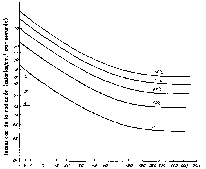¹ Intensidad de radiación equivalente al promedio que normalmente se produce a 1,5 m. sobre la superficie del Huelo y a una distancia de 1,5 m. de las llamas que alcanzan entre 3 y 6 m. de altura.² Intensidad de radiación equivalente al promedio que normalmente se produce al nivel del suelo a una distancia de 1,5 m. de llamas cuya altura alcanza entre 3 y 6 m.