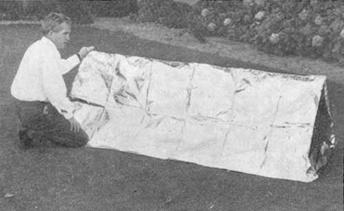 La tienda tiene forma de V invertida de 2,40 x 1,20 m. de base y 60 cm. de altura hasta el vértice (Figuras 2 y 3). Los extremos están casi cerrados, aunque se dejan a propósito unas pequeñas aberturas que sirven de miraderos. El ocupante se apoya en cintas que cruzan la anchura de la tienda y ésta está dotada de extensiones de sus extremidades que pueden doblarse bajo el ocupante y quedan fijas por su poso. Esta forma de fijar la tienda es indispensable pues las corrientes originadas por el incendio pueden alzarla dejando al bombero al descubierto y exponiéndolo a radiaciones intensas.