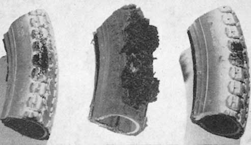 La protección que la pintura a base de aluminio puede proporcionar a los neumáticos de los vehículos fue ensayada de la siguiente manera: se sometieron cortes del neumático, uno sin tratar y otro pintado con dos pinturas adecuadas, a diferentes intensidades de radiación (Cuadro 1). Después de haber estado expuestos a las radiaciones durante 40 minutos, el neumático no tratado reveló un mayor deterioro (Figura 4). Sólo en situaciones excepcionales los neumáticos estarán tanto tiempo expuestos al calor (por ejemplo, en operaciones de limpieza en las que comúnmente los vehículos tienen que estacionarse junto a montones ardientes de combustible pesado).