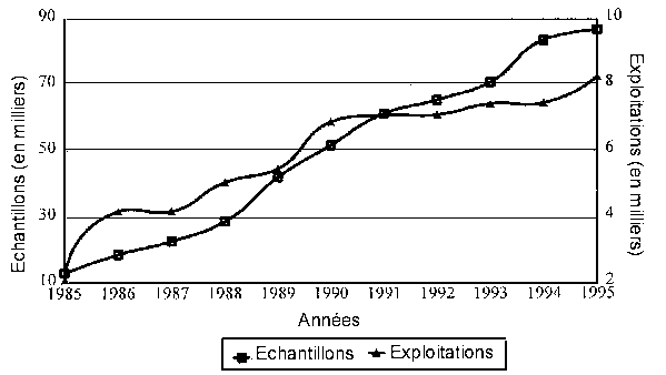 Depuis la dernière décennie, le nombre d'entreprises concernées par le Plan d'amélioration de la qualité du lait, et par conséquent le nombre des échantillons analysés, ont augmenté constamment (Fig. 1). A la fin de 1994 (A.R.A., 1994), 185 techniciens (92 zootechniciens, 93 vétérinaires et 10 techniciens coordinateurs) s'occupaient de l'assistance technique en faveur de 8 292 entreprises pour un total de 1 830 487 têtes entre ovins et caprins. Les résultats de l'amélioration de la qualité bactériologique du lait ont été particulièrement intéressants: en effet, en comparant les valeurs moyennes de charge bactérienne relevées l'année où le Plan a démarré avec celles de 1995, on remarque une baisse de plus de 42%.