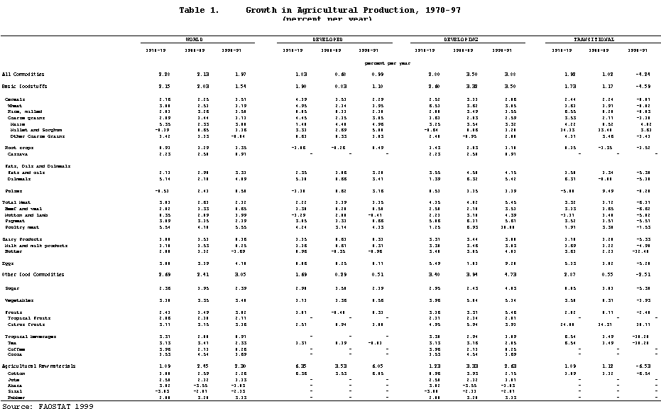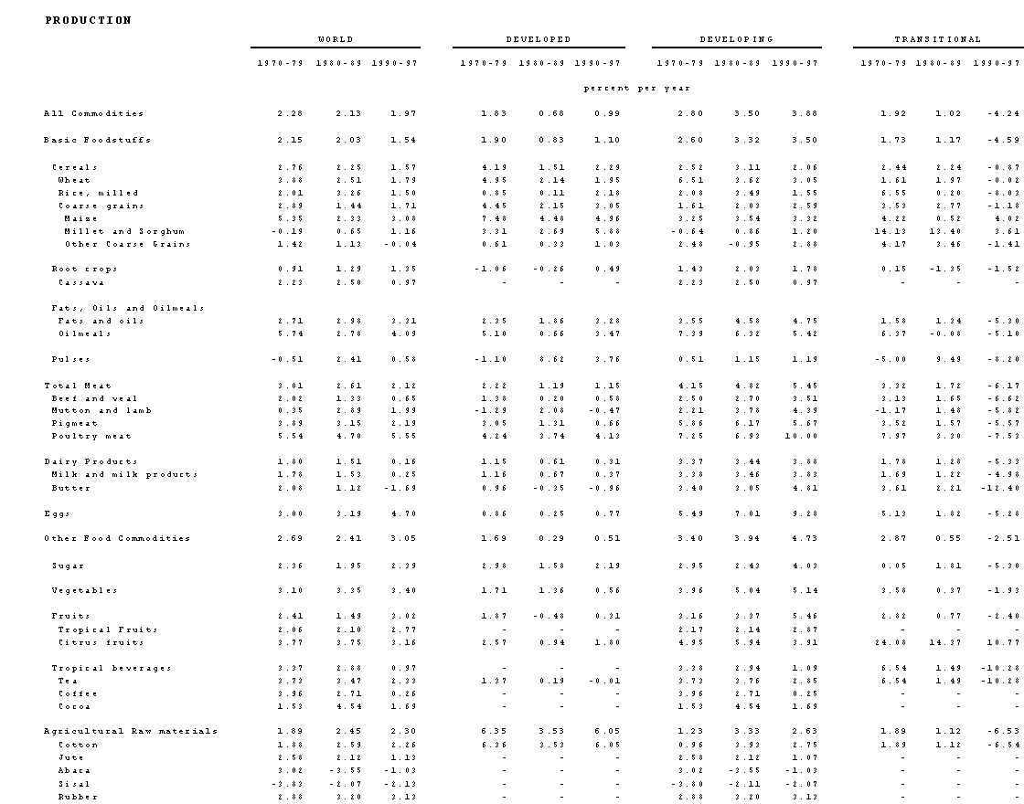 3. In the developing countries (taken as a group), production and consumption of the main agricultural products have been growing at much higher (and increasing) rates than in either the developed countries or economies in transition. In fact, in the case of the economies in transition, there were sharp contractions in both production and consumption in the last eight years compared with the previous decades, reflecting the economic dislocations associated with systemic changes in these countries. As a whole, developing countries' demand accelerated from around 3 percent per year in 1970-79 to about 4.1 percent in 1990-97.1 Production growth lagged somewhat behind, but rose nevertheless from 2.8 percent in the 1970s to about 3.9 percent for 1990-97. By contrast, the developed countries' production growth rate decelerated to 0.68 percent from 1.8 percent in the 1970s and recovered somewhat in the 1990s. Their consumption of the main agricultural products expanded at decreasing rates, falling from 1.5 percent in the 1970s to around 0.5 percent in the 1990s.