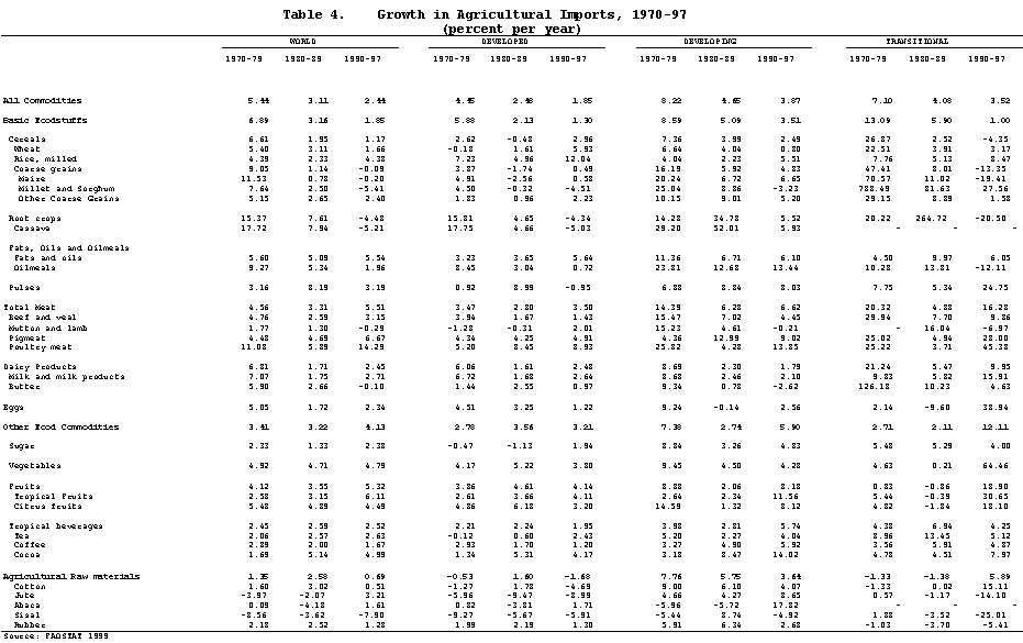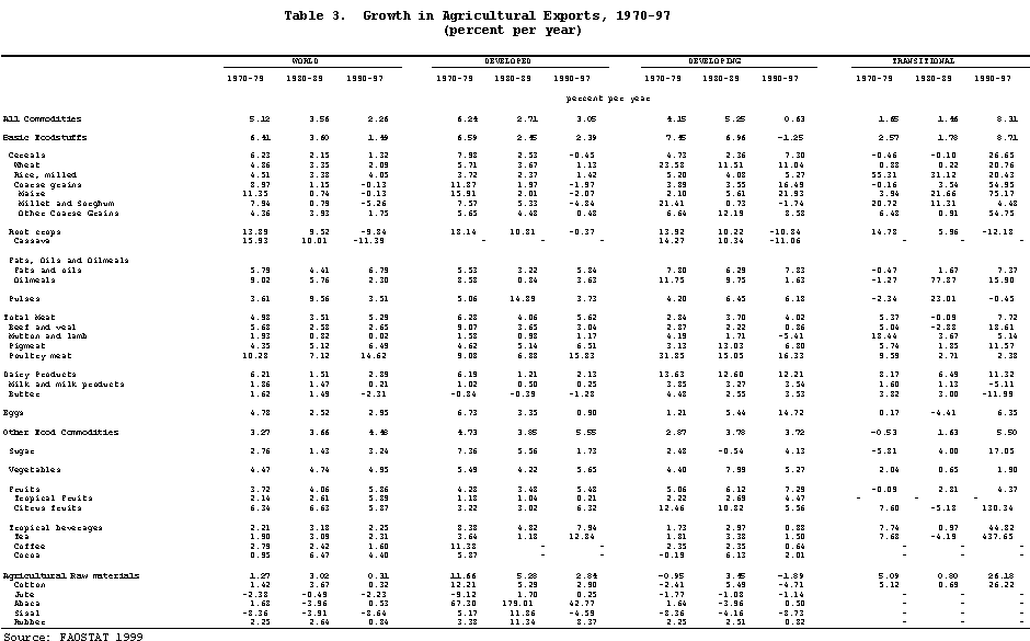 30. Despite the beneficial effects of policy reforms, the previously identified slowdown in world trade in agricultural commodities is expected to continue, but the picture is quite complex, with an increase in growth rates for cereals, dairy, tea and coffee and some raw materials. The slowdown in trade is based on the sharp falls in growth foreseen for fats, oils, oilmeals, meat, fruit and cotton. The slowdown in the markets for the major agricultural products could, however, be offset by growth in some other sectors, particularly in the processed food products. The net agricultural trade position of the developing countries is expected on the basis of these projections to deteriorate, so that they are likely as a whole to be net importers of agricultural products in the future. For the same reasons, the imports of the economies in transition are also expected to grow significantly over the projected period. As a result, the growth rates of exports of the developed countries are expected to increase sharply over the projection period relative to the previous decade.