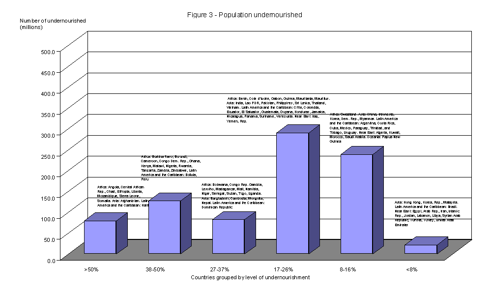 18. The very low levels of food availability still prevailing in several developing countries imply that undernutrition is widespread. FAO estimated that there were roughly 830 persons undernourished in the developing countries in 1994-96 (see Table 5), with high concentrations in South Asia and sub-Saharan Africa (see Figure 3)5. Progress in reducing these numbers has been painfully slow, with reductions in East Asia being offset to a large extent by increases in sub-Saharan Africa.